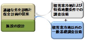 積雪寒冷地では、屋外施設に積雪荷重が作用したり、また凍結・融解によるコンクリート部位の劣化が進みやすかったり、融雪水等による錆が発生しやすい環境にあります。また、一部では特有の泥炭性軟弱地盤上に機場が造成されているなど、機場支持や水理的諸元の確認が必要となります。