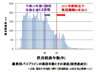 農業用の管水路(パイプライン)は、昭和40年代から本格的な整備が始まり、その基幹施設のストックは約1万2千q以上となっています。現在では標準的な耐用年数40年を超える延長が増え、今後の10年間に耐用年数を超える延長がさらに増えます。