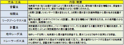 その他として、埋設された管路の漏水の有無を検査する方法として、表のような方法等が採用されます。